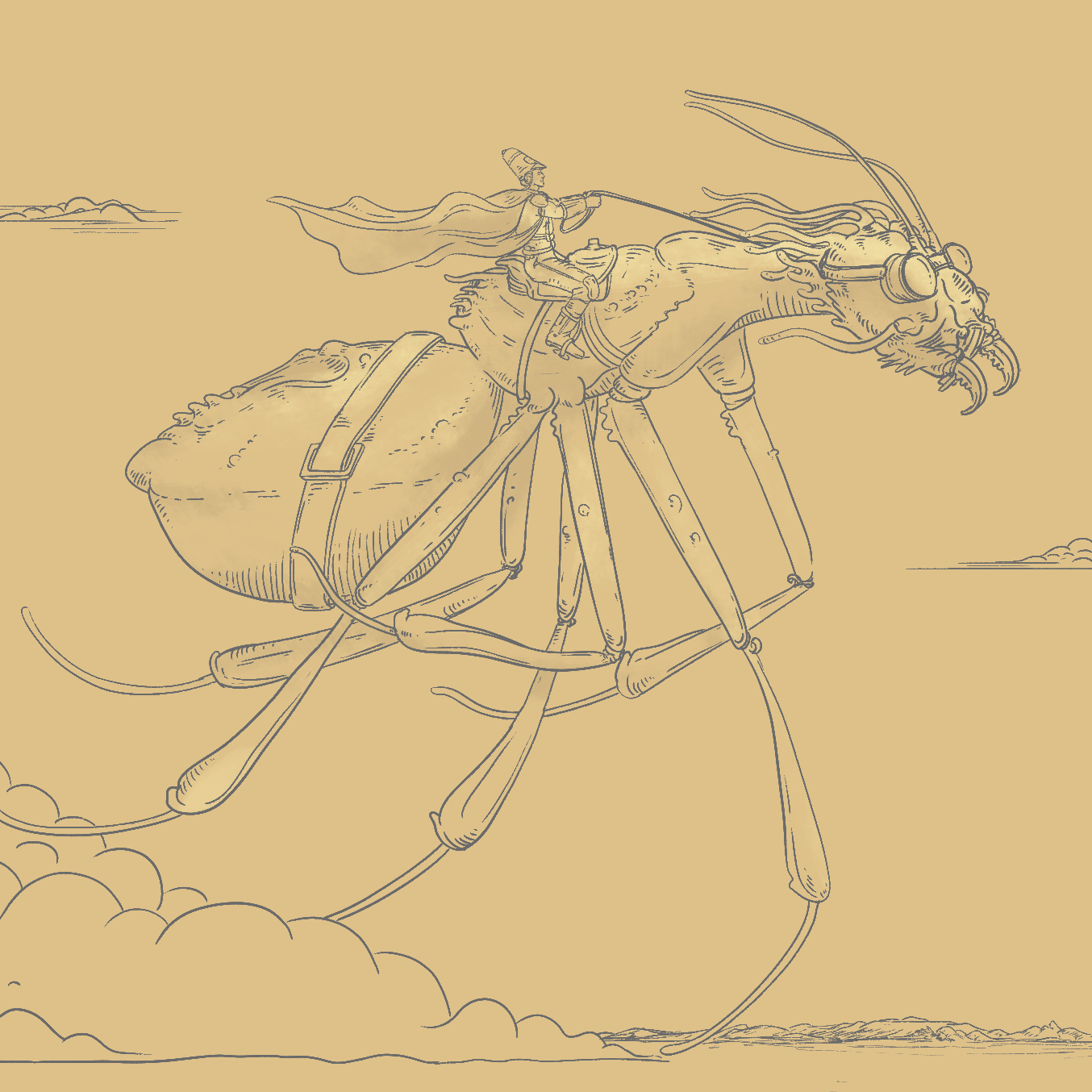 It brought to my mind the scenes drawn by Moebius with weird creatures running at full gallop while the rider can feel the gentle touch of the wind on its face.